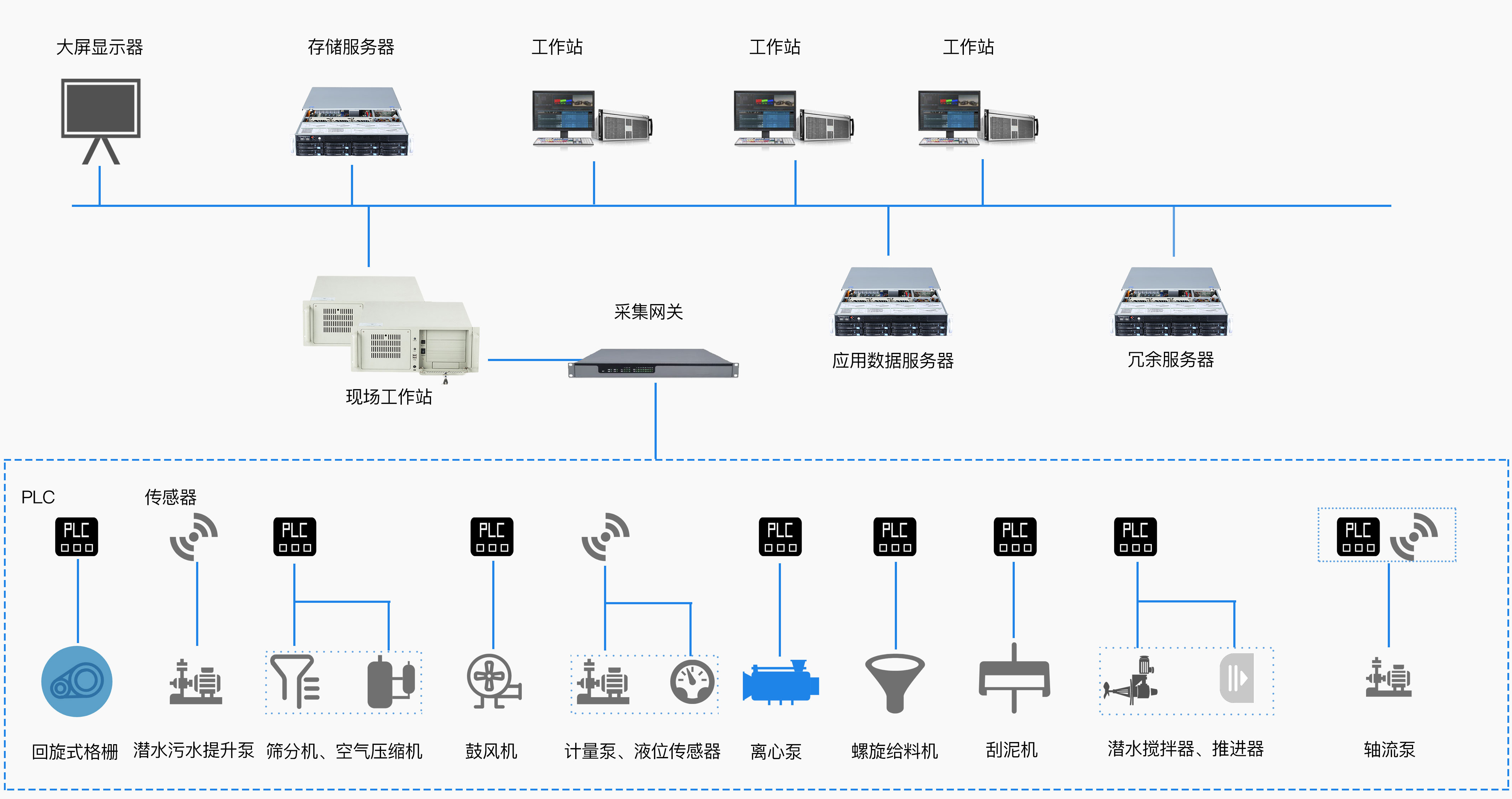 污水處理系統運行于污水處理廠中控室的計算機中,主要分為儲存服務器,數據處理服務器,冗余服務器,還有操作員用的工作站(現場操作的工作站,后臺的監(jiān)督工作站),軟件配合計算機將所有工藝環(huán)節(jié)數據與控制數據進行采集,計算機上使用形象立體畫面表現水廠工藝流程及各種數據,并對水廠進行相應的控制,同時實現對各種數據的分析處理。對污水廠提高運行效率,降低運營成本、提高管理水平起著至關重要的作用。