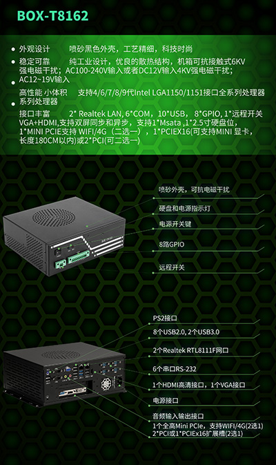 2個Realtek RTL8111F網口(10/100/1000M自適應),6個串口RS-232 (RS485需加模塊),8個USB2.0, 2個USB3.0,方便ODM定制,保證客戶現場復雜的應用需求;HDMI、VGA雙顯示接口,1路音頻輸入輸出;8路數字開關量GPIO(4*GPI,4*GPO,可自定義),1個遠程開關,1*mSATA,1*SATA 2.5"SSD用于存儲;1個全高Mini PCIe,支持WIFI/4G(可二選一),2*PCI或1*PCIEx16擴展槽(二選一), 用于集成各種附加卡,例如I/O卡,運動控制卡、視覺卡和GPU卡(可支持長度180CM的獨立顯卡)。能滿足不同市場的多樣化需求,可廣泛應用于工業制造、自動化檢測、工業視覺檢測、智能交通等領域。