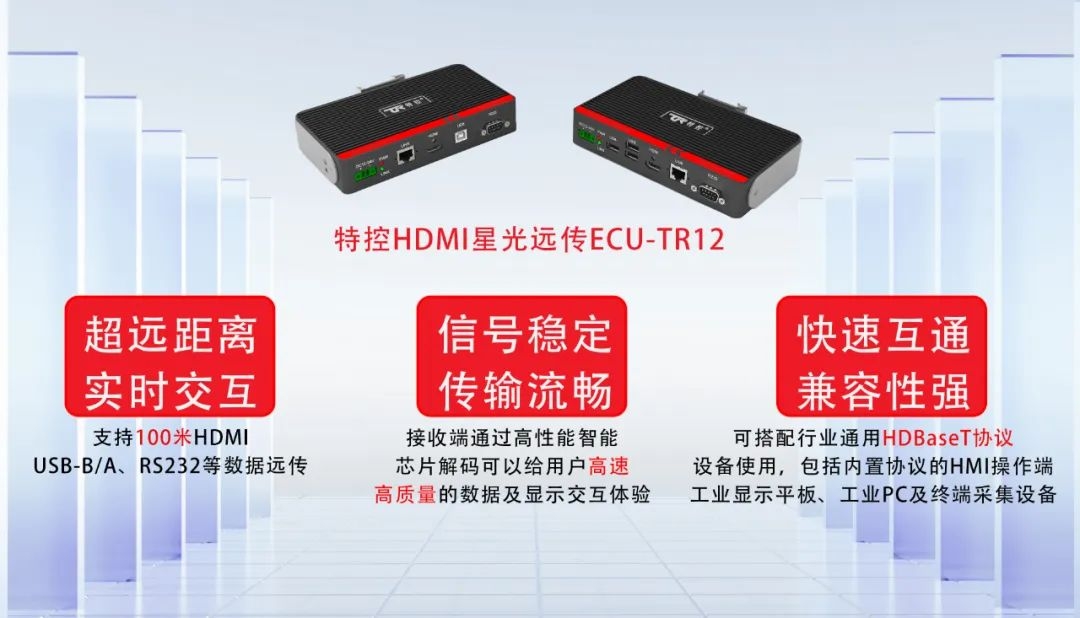 工業設備的迅速發展,隨著尺寸變大,主機與顯示器的距離隨之變長。設備功率也越來越大,隨之帶來的電磁干擾也是越來越強。在這種長距離強干擾的應用環境,加上HDMI/DVI/VGA自身信號傳輸的能力有限,就算使用高規格線材也無法適用這樣的應用環境。特控深研客戶現場需求,以解決客戶實際問題為目的,推出遠距離傳輸控制解決方案。