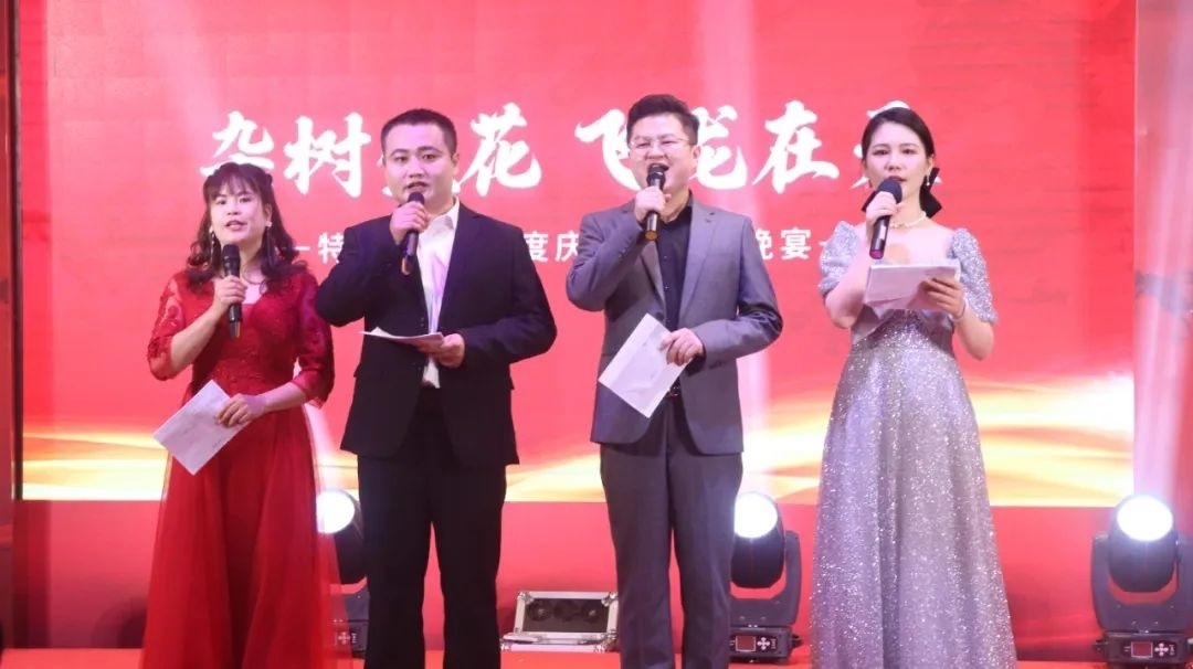 玉兔辭舊春華啟,龍騰新春氣象新。四位主持人宣布晚宴開始!