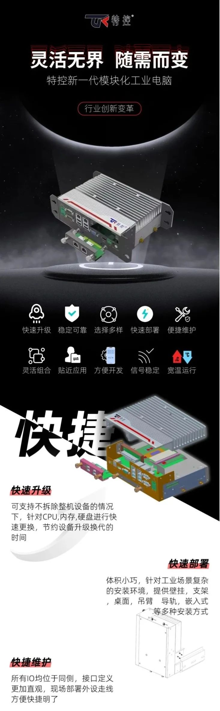 靈活無界,隨需而變,特控新一代模塊化工業電腦,行業創新變革。快速升級、穩定可靠、選擇多樣、快速部署、便捷維護、靈活組合、貼近應用、方便開發、信號穩定、寬溫運行。